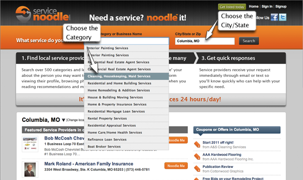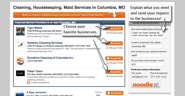 What is ServiceNoodle.com?Ever notice you can buy nearly any product online you want? Amazon, eBay, Craigslist and a billion other sites are wonderful places to buy products. But what about local services? Can you easily hire a plumber, a carpet cleaner, a mowing service, or other business professionals 24 hours a day?? Usually not... until now. ServiceNoodle is an online directory packed full of local service-based businesses that offers fantastic information before you hire someone. You can call the business from our directory or "noodle" your favorite businesses any time day or night! Simply complete a short form telling what you need, when you need it and even how much you want to pay for it, if you'd like. In fact, if you're in a time crunch... you can send the same service request to 10 businesses at the same time. For example, if it is 9pm at night and you have unexpected company coming tomorrow, simply go to ServiceNoodle and send the same noodle request to a few cleaning companies letting them know you need your house cleaned by 11am! The ones who can help usually contact you very quickly! Have you noodled lately? Try it out! First choose your location and category,
